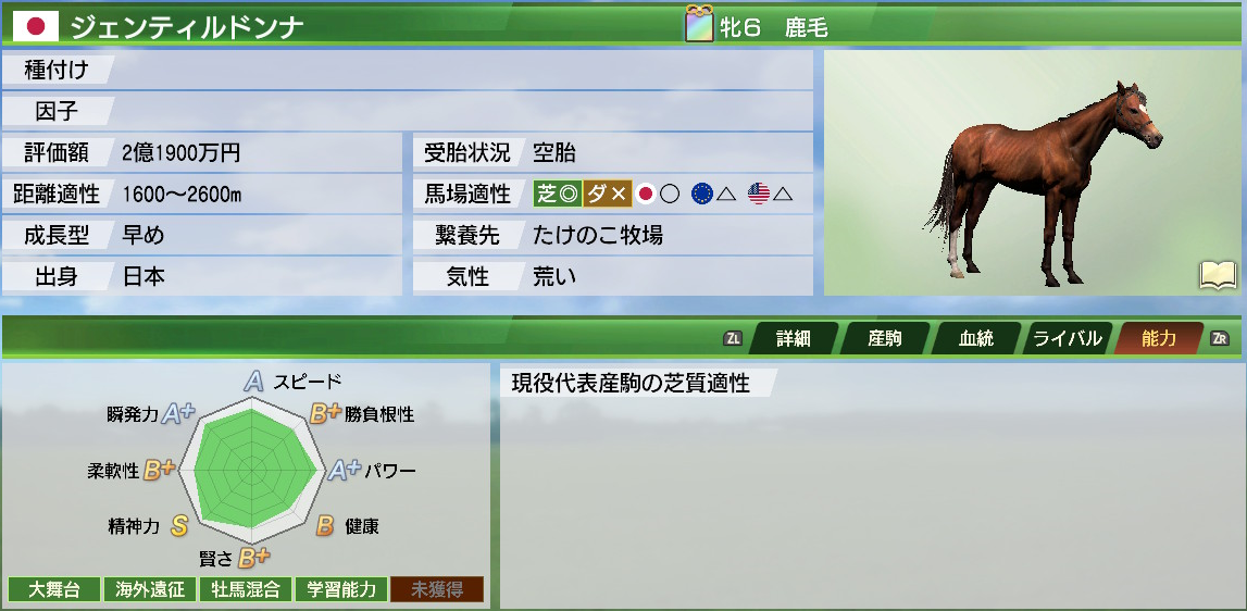 スピード、サブパラともに高く、ゲーム内でも史実と同様に3冠が達成可能な能力を持っています。