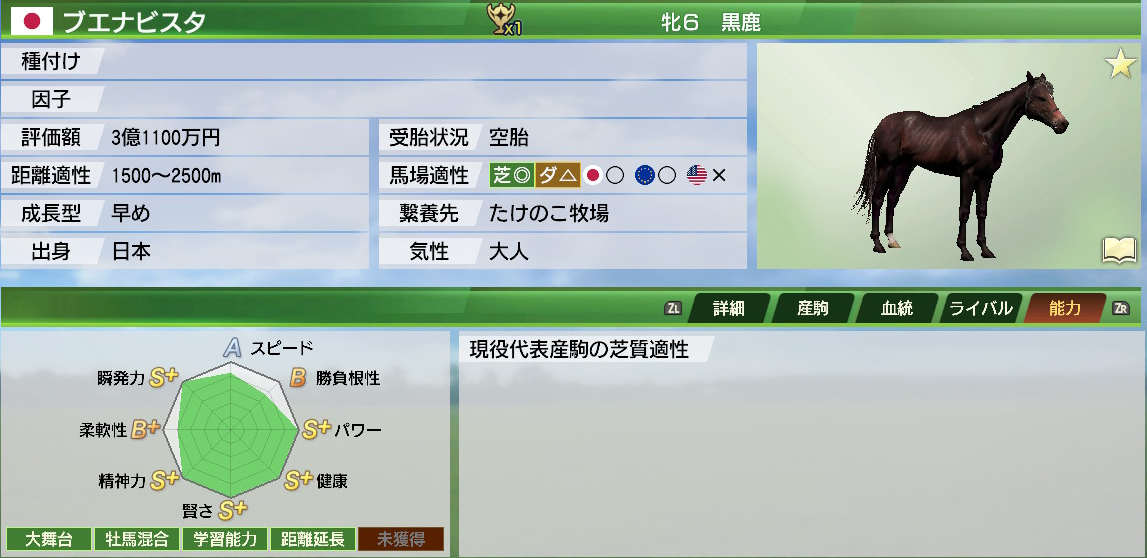 ブエナビスタは2006年に誕生の牝馬で、スピード、サブパラともに高く、牝馬三冠も容易に達成できる能力を持っています。